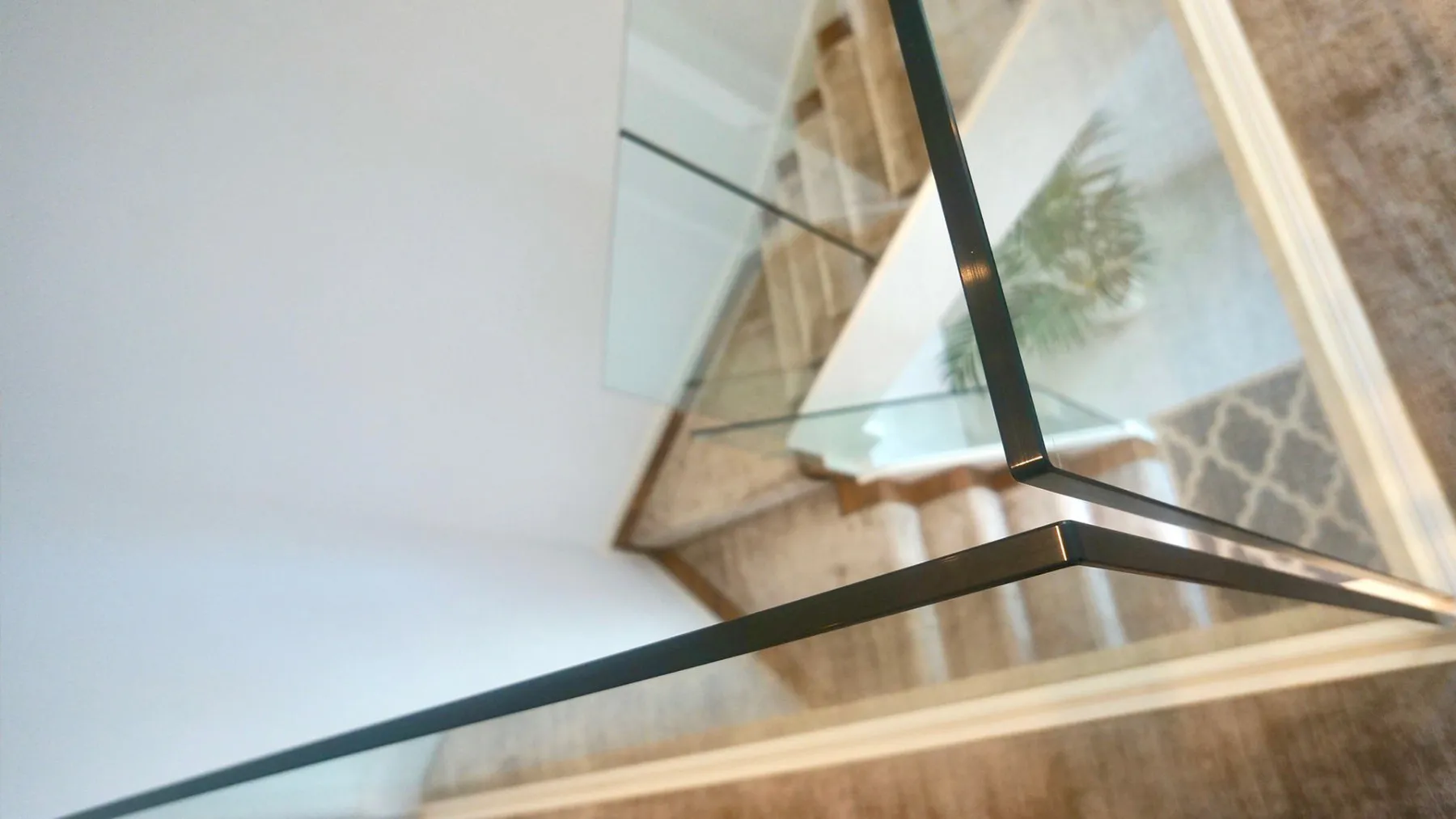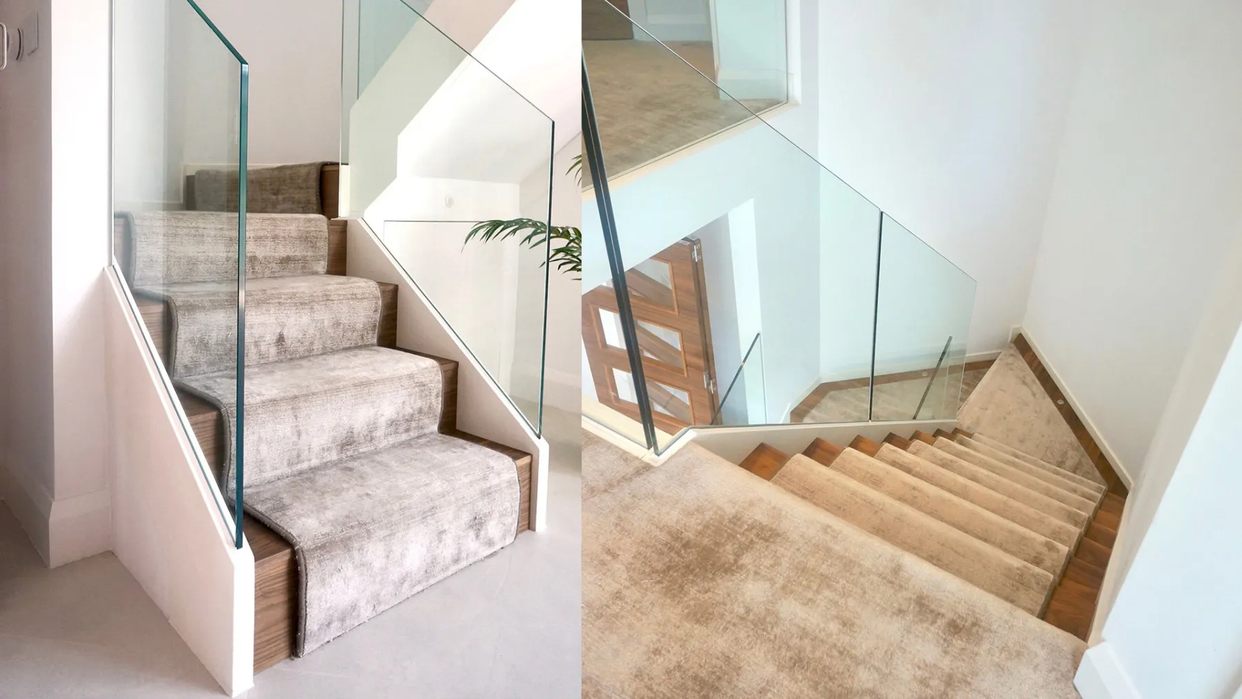 White timber stringers combined with walnut finish treads and risers work seamlessly with a toughened glass balustrade and a luxurious carpet runner.