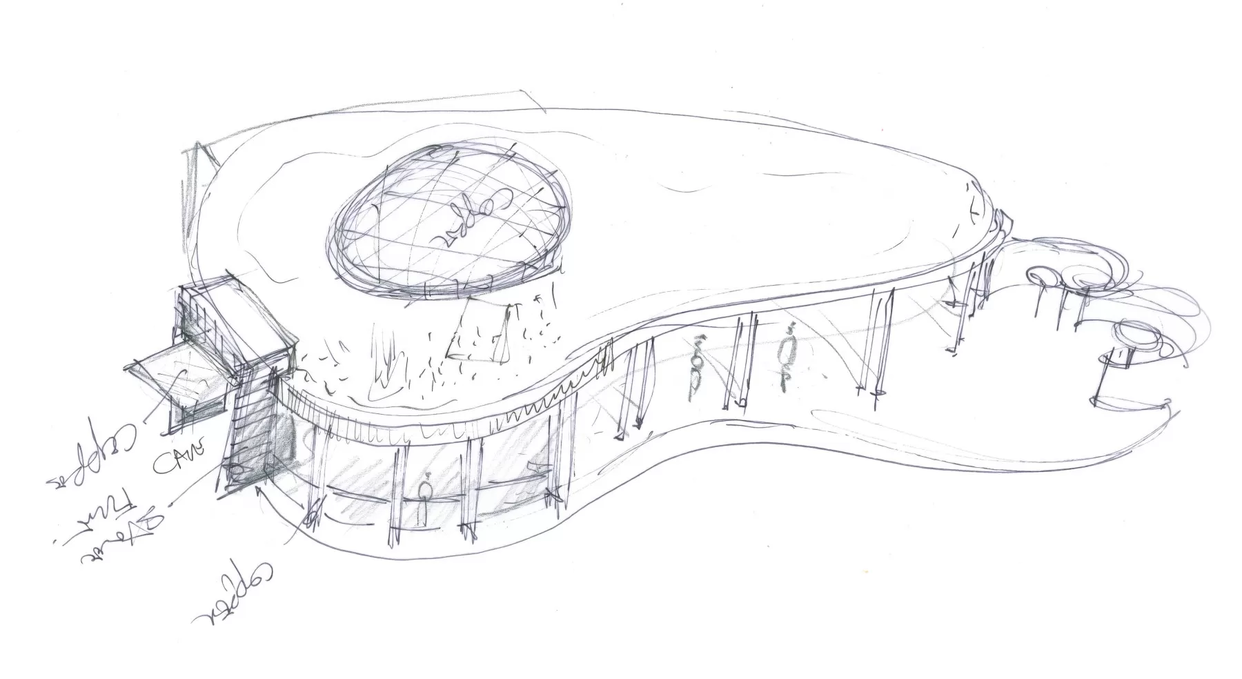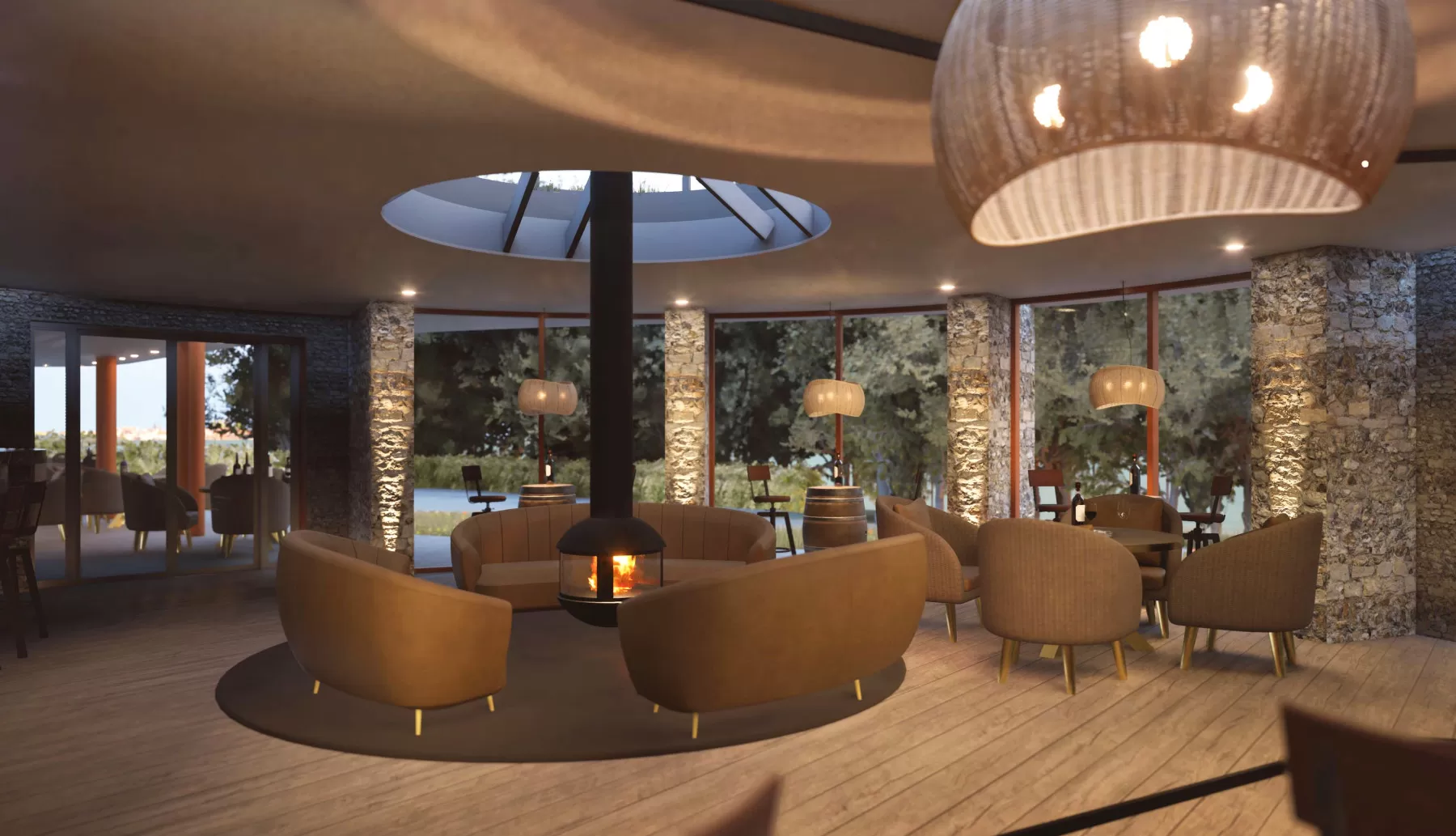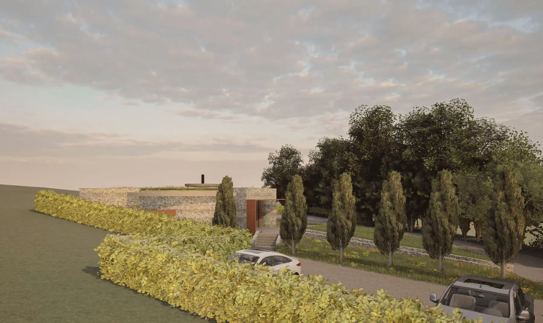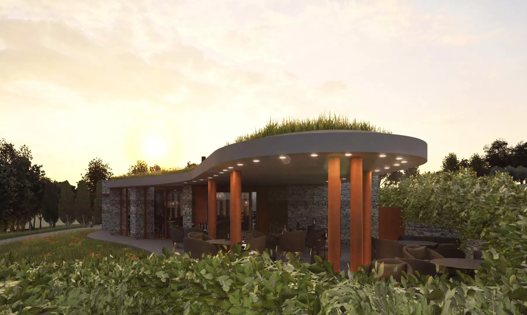 DJA’s concept design for a wine tasting centre located in a beautiful rural location in the south of England. Designed to complement the natural landscape, the form appears to emerge from the sloping wildflower field. Natural flint walls, Corten steel elements and a sedum roof enhance the design’s eco credentials, with the interior blending seamlessly with the outdoor space, creating in / out living.