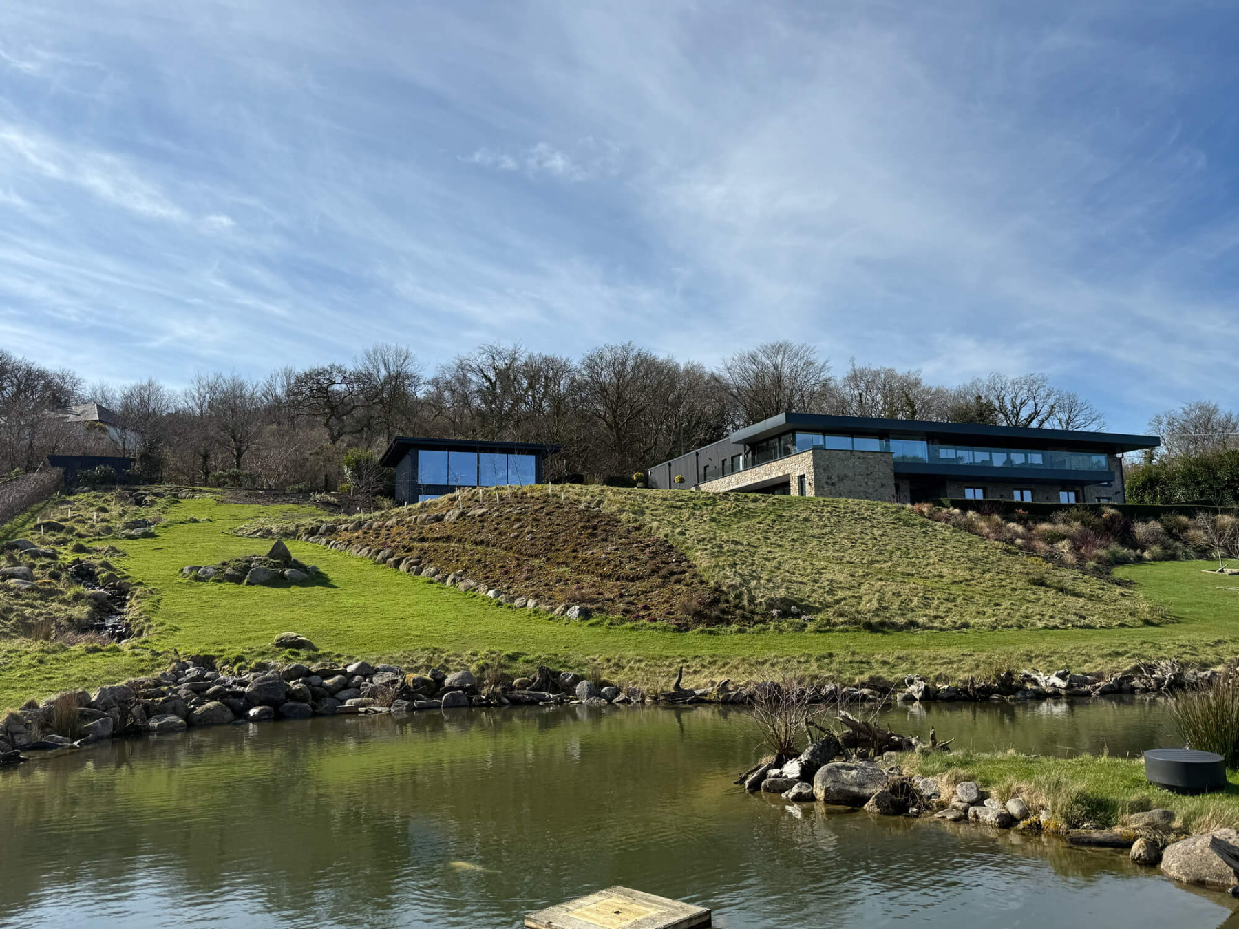 Designed by DJA for renowned developers Westcountry Land, this contemporary house is located on the fringes of the beautiful Dartmoor National Park. This stunning design for a state-of-the-art 6-bedroom dwelling works in harmony with challenging topography, embracing the rural setting and spectacular views. The dwelling appears to cascade down the hillside with a single storey elevation to the front.