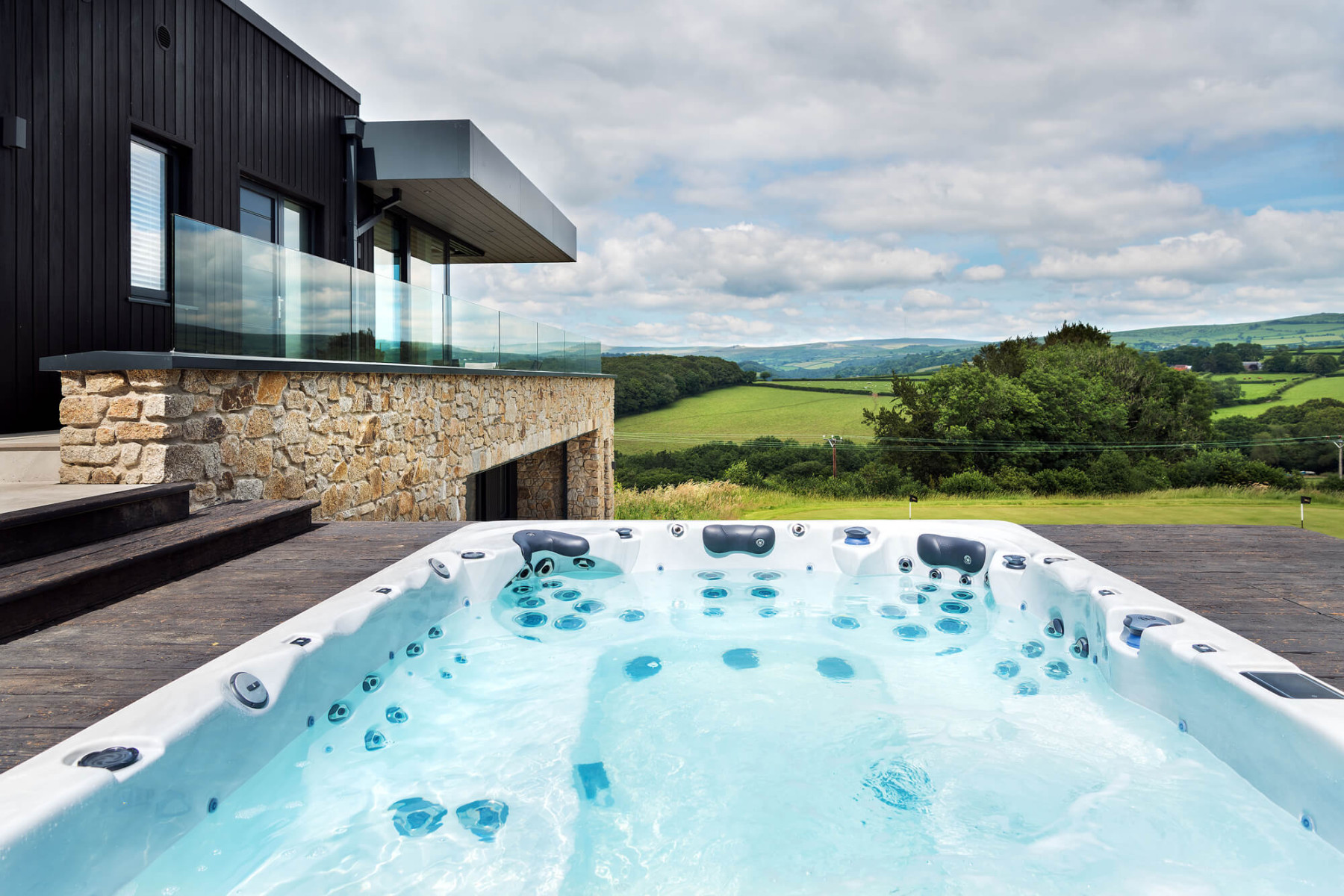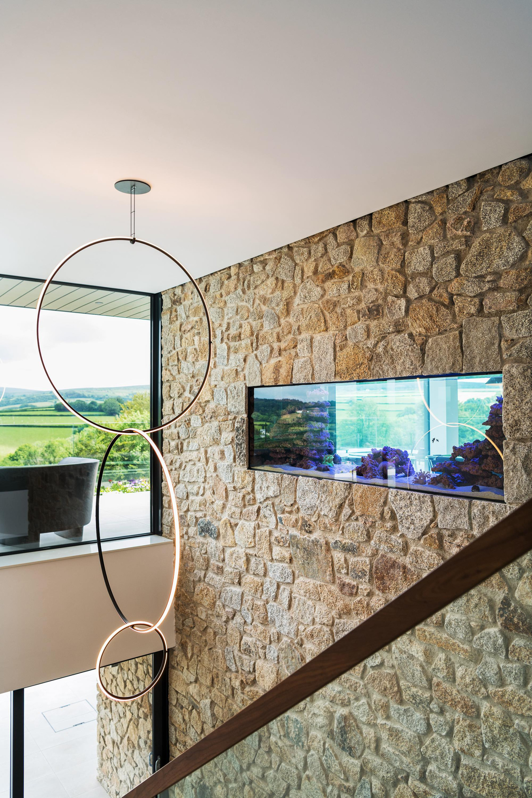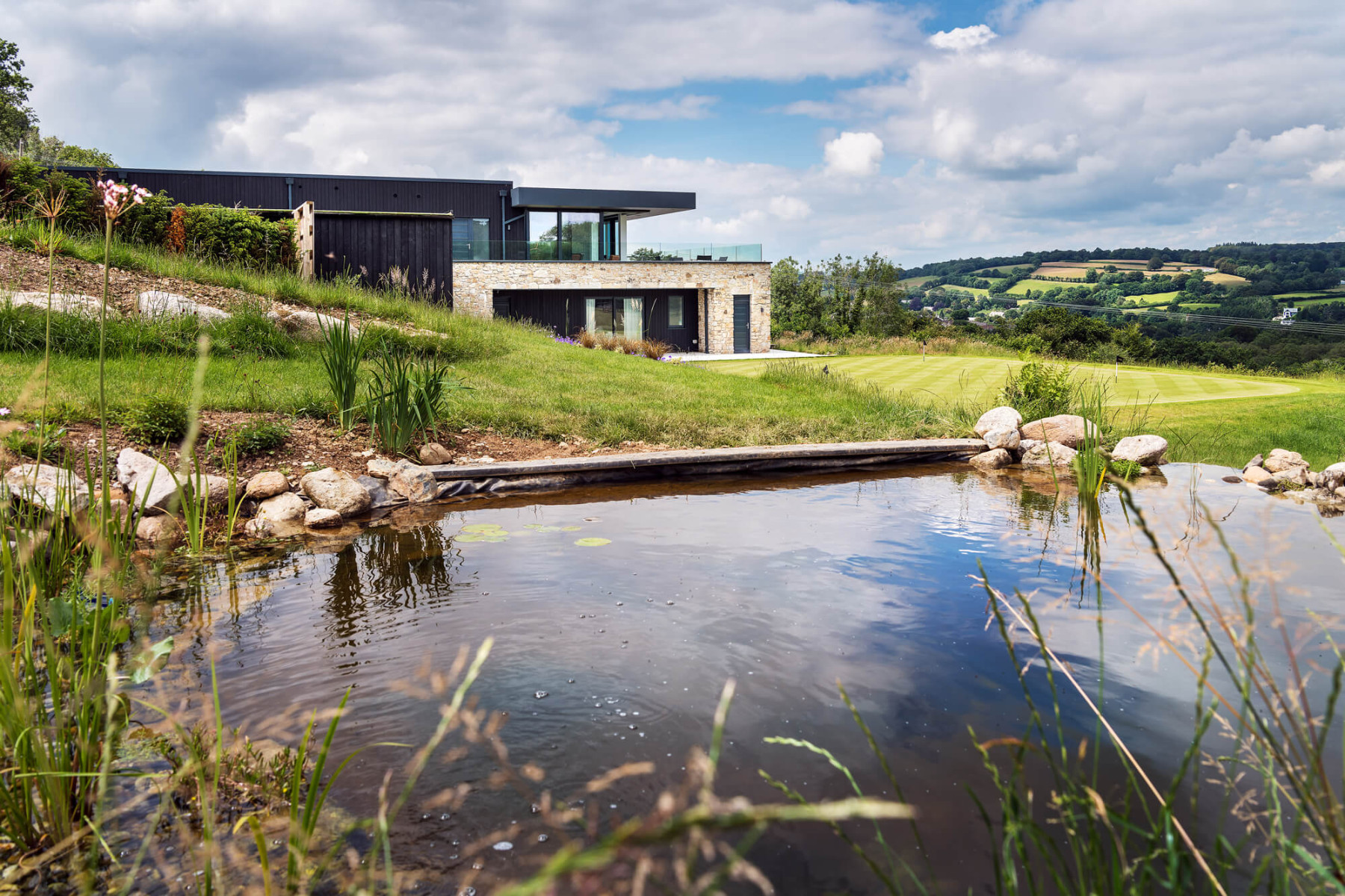 The uppermost floor features living areas with wall-to-wall glazing making the most of the fantastic views on offer. External materials of stone and burnt timber cladding create a natural palette complementing the rural setting.