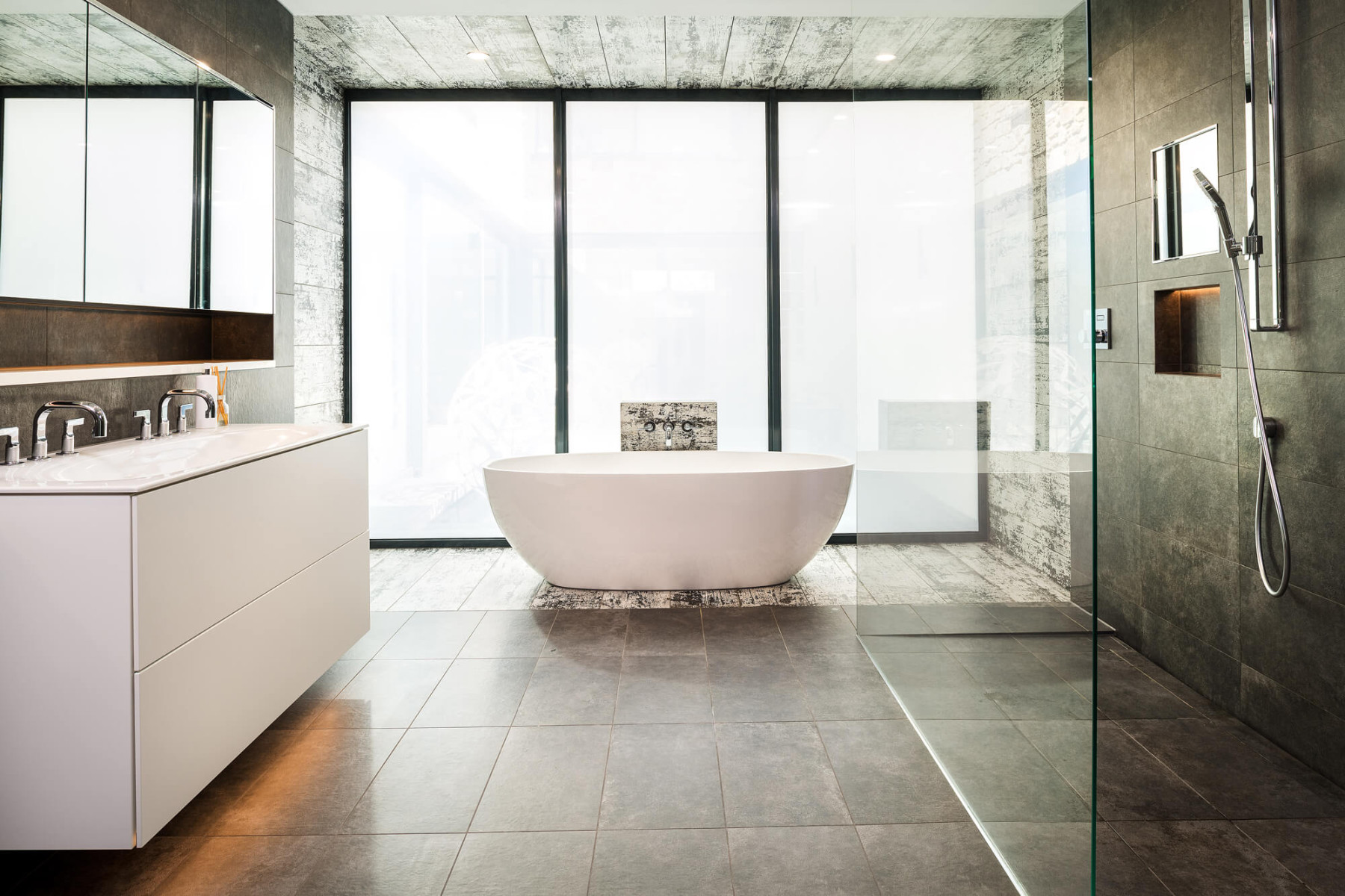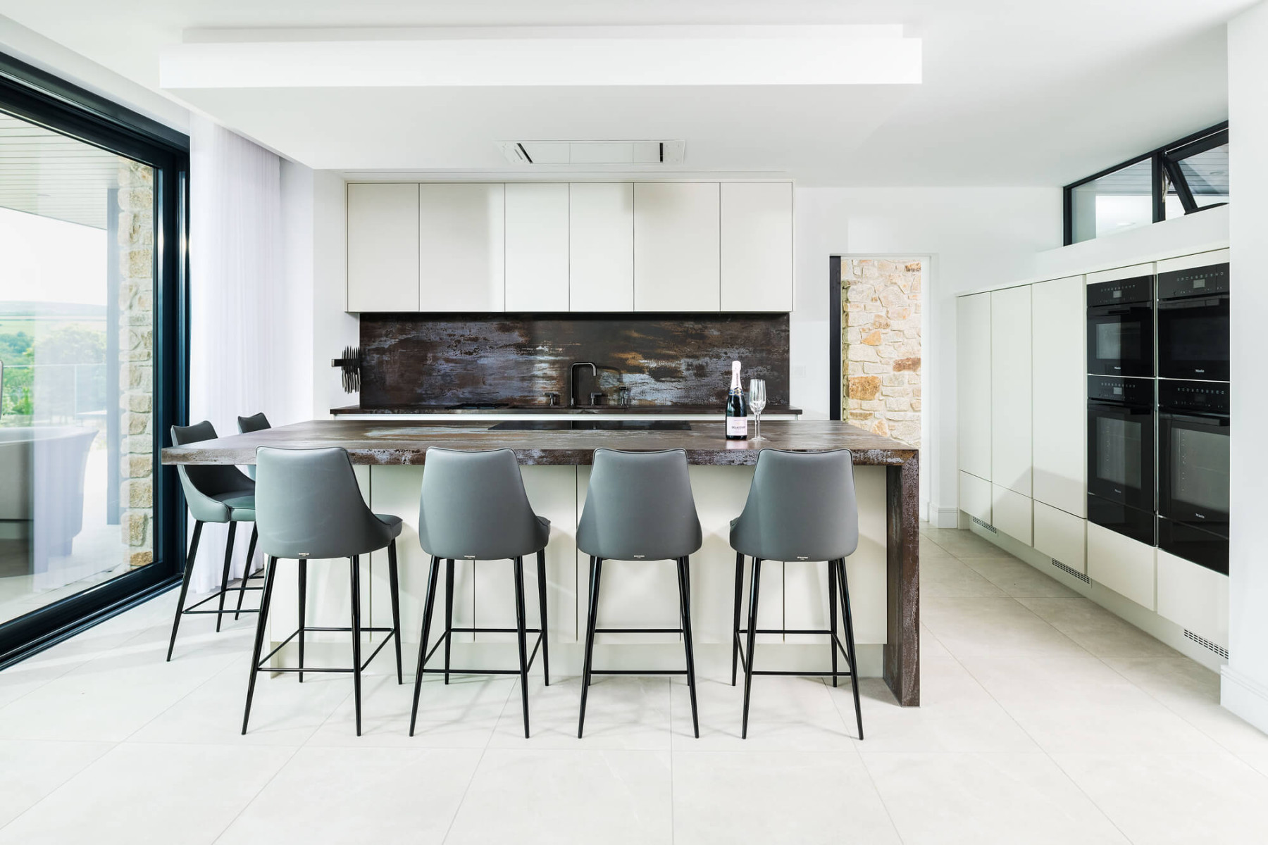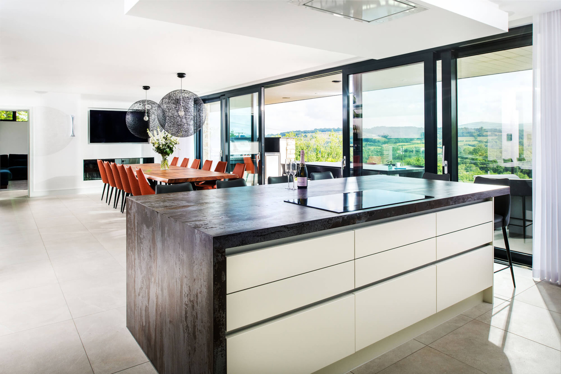 The uppermost floor features living areas with wall-to-wall glazing making the most of the fantastic views on offer. External materials of stone and burnt timber cladding create a natural palette complementing the rural setting.