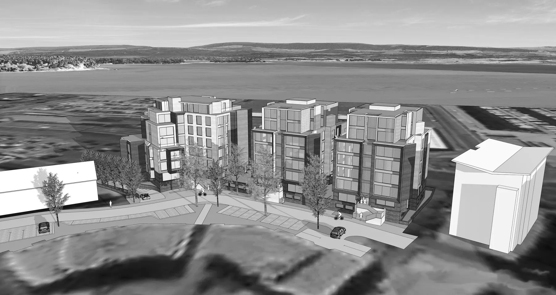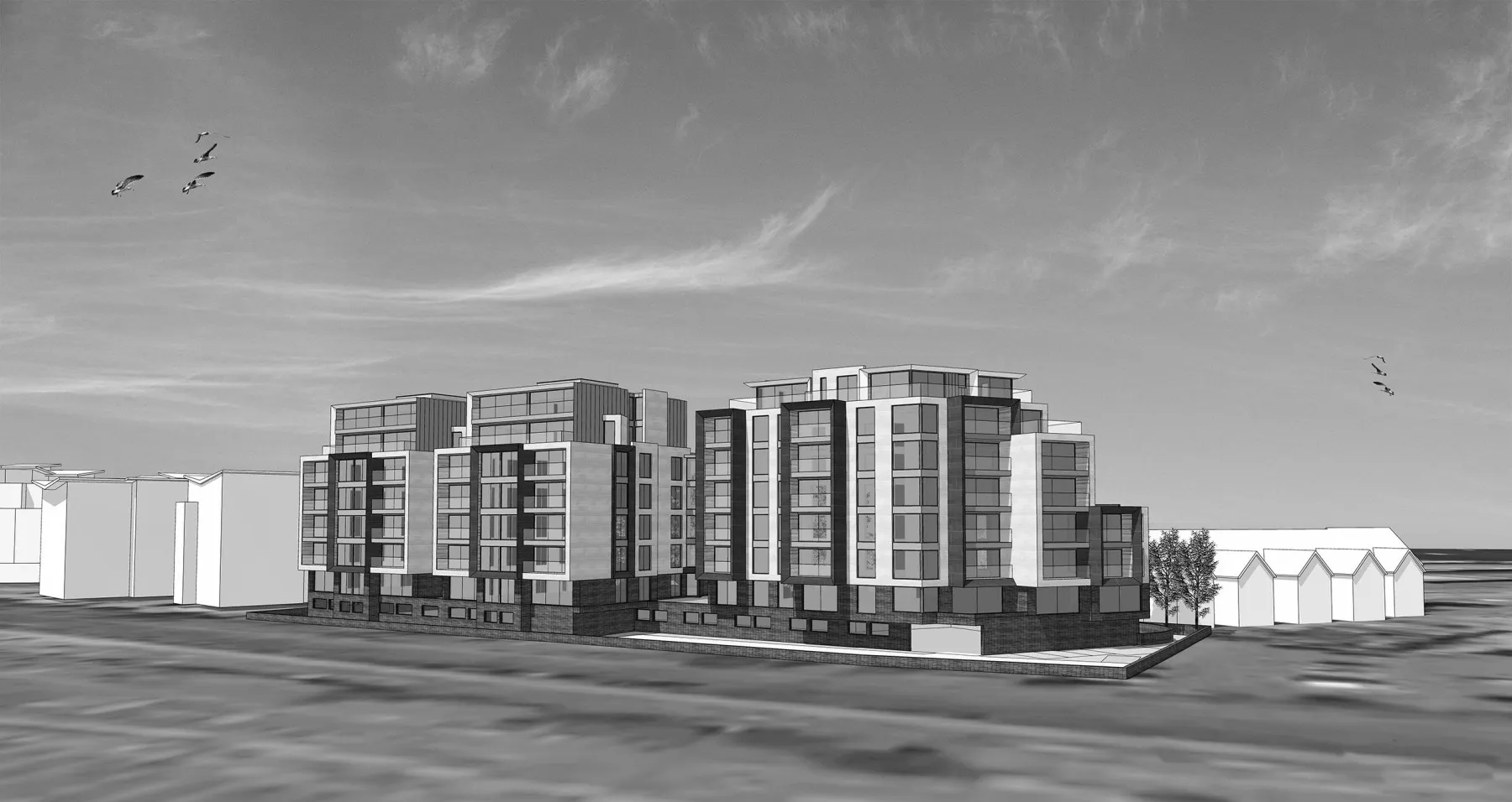 DJA’s design for a contemporary scheme located in Poole, Dorset. The development comprises 99 apartments allocated between 3 blocks, utilising various cladding materials in conjunction with ‘green’ sedum roofs where possible.